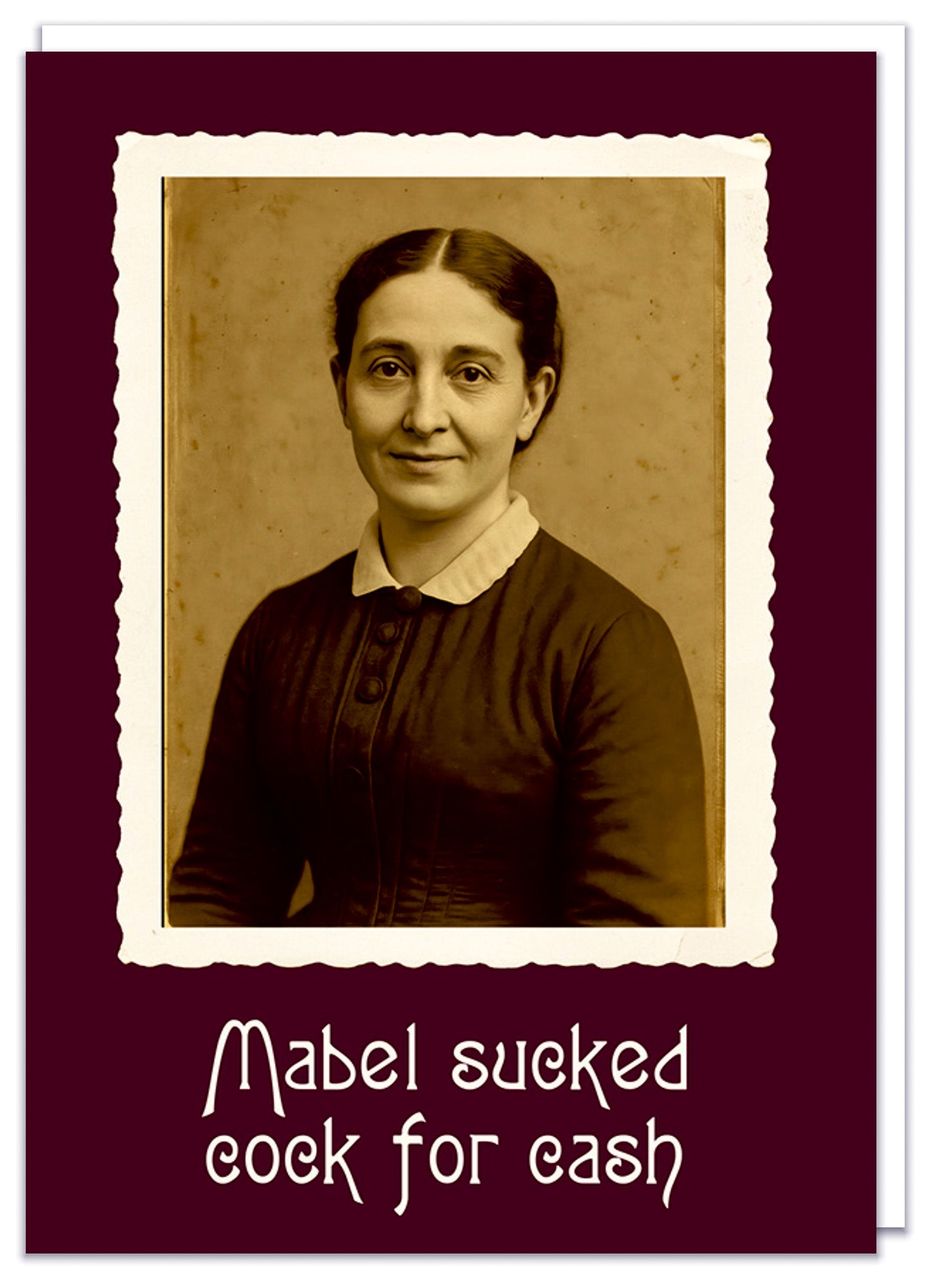 A funny birthday card featuring a Victorian sepia photo of a smiling middle aged woman against a brown background. Antique text underneath the picture reads Mabel sucked cock for cash.