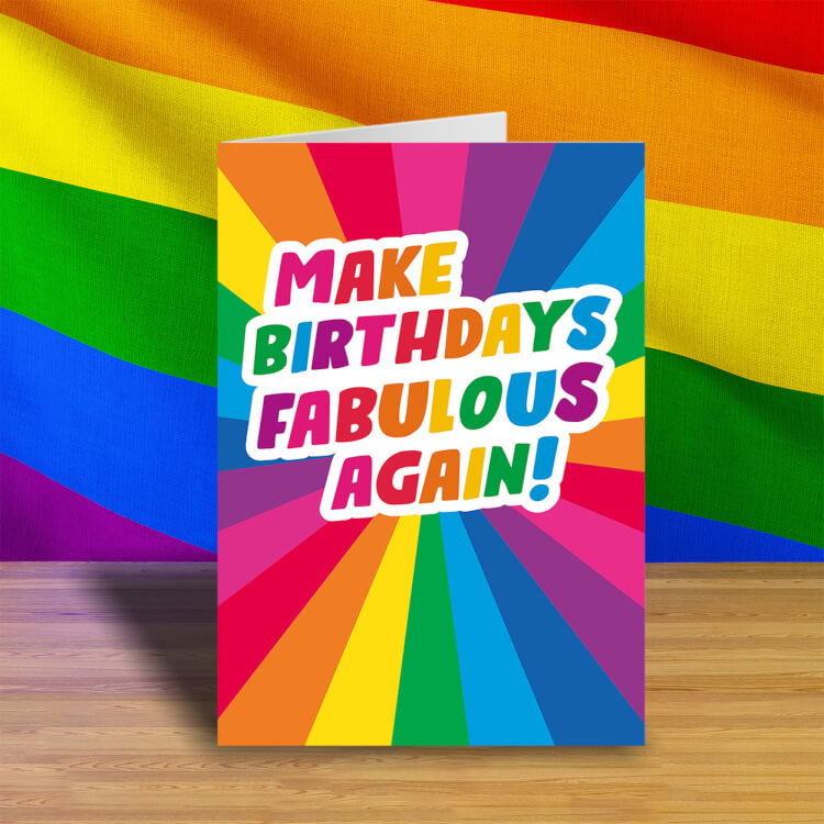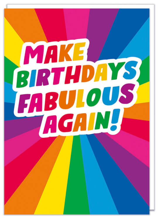 A bold rainbow patterned birthday card multicoloured rainbow text surrounded by a big white border that reads Make birthdays fabulous again.