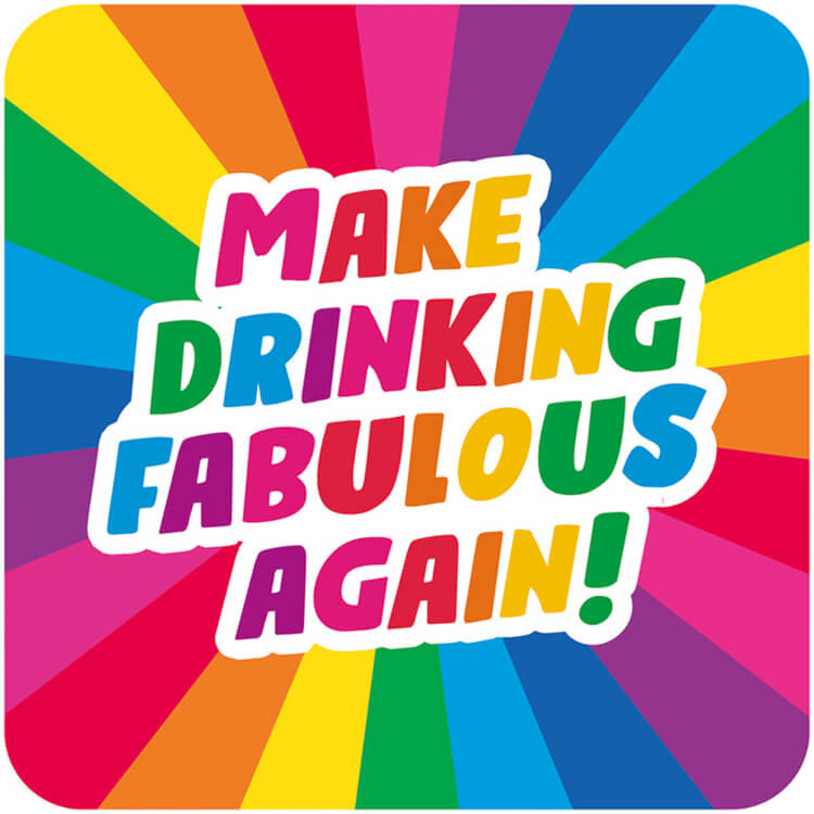 A bold rainbow patterned coaster. Multicoloured rainbow text surrounded by a big white border that reads Make drinking fabulous again.