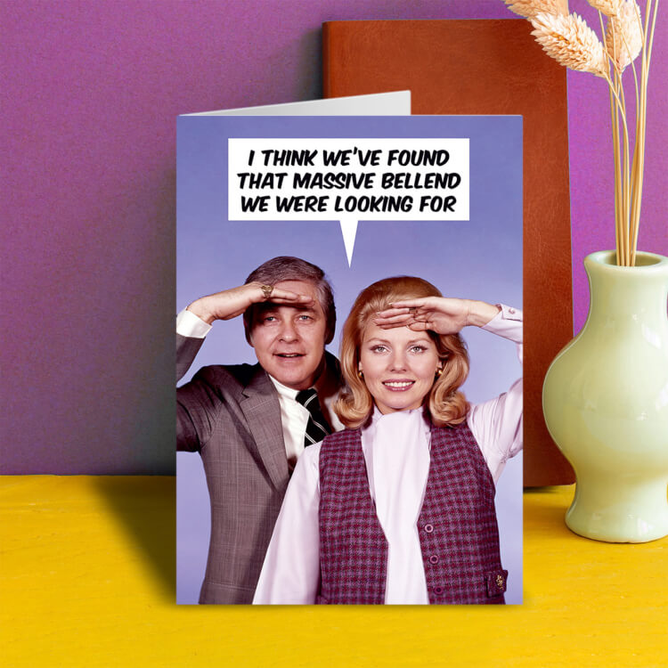 A birthday card with a 1960s photo of a male and female couple, hands raised over their eyes looking at camera. A speech bubble from them reads I think we've found that massive bellend we were looking for.