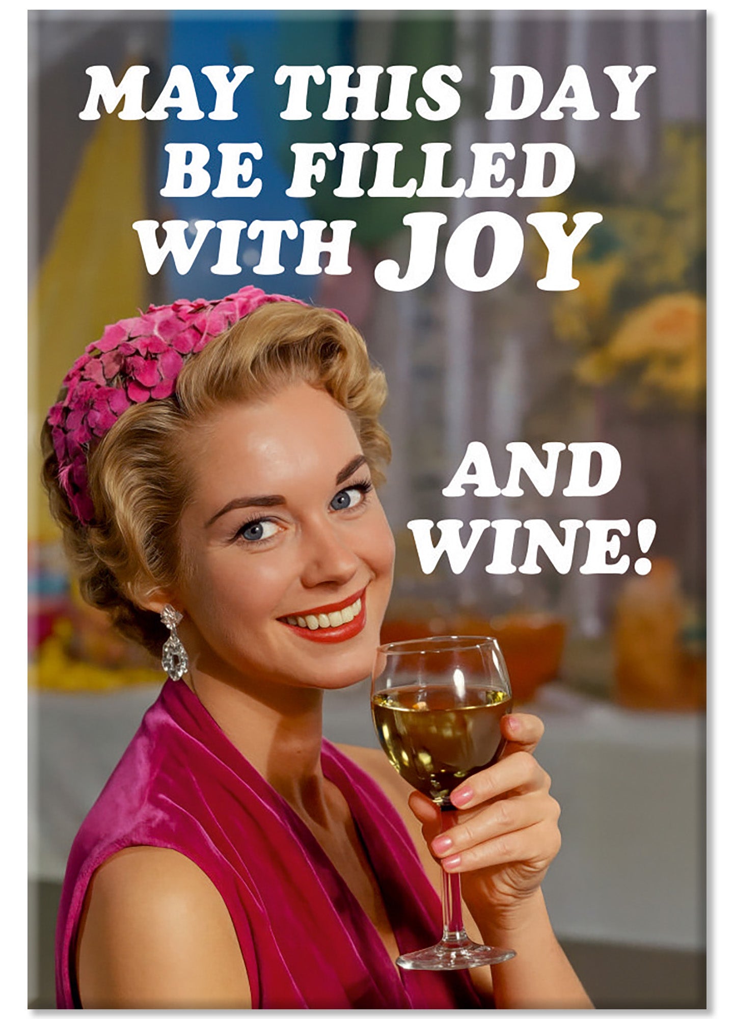 A picture fridge magnet featuring a smiling mid-century style woman holding a glass of white wine. The text reads “may this day be filled with joy and wine!” arranged in stacked lines above and beside her. The design uses warm, cheerful colours, with pink tones in her outfit, soft golden hues in the wine glass, and a subtly blurred, cosy background that gives it a classic vintage feel.