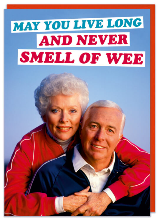 A birthday card with a 1990s picture of a smiling old couple hugging. Text above them reads May you live long and never smell of wee.