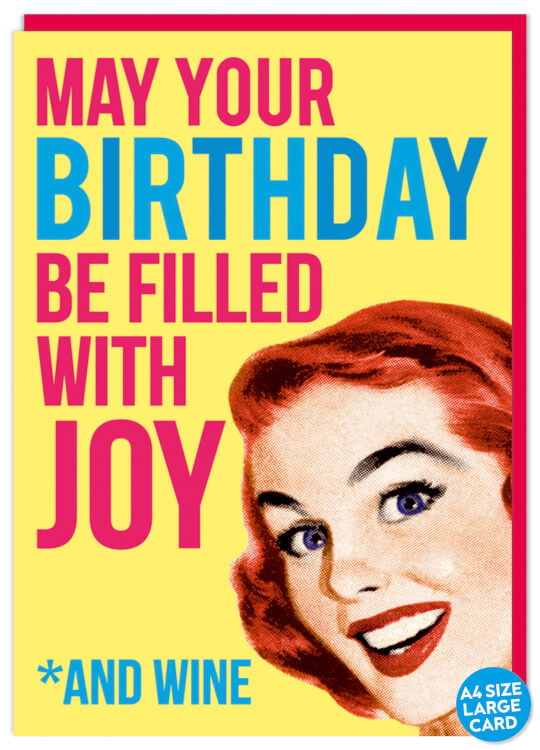 A yellow card with a retro-style drawing of a smiling woman in the corner of the card and next to her are the words ‘May your birthday be filled with joy *and wine’ in capitalised, blue and pink font.