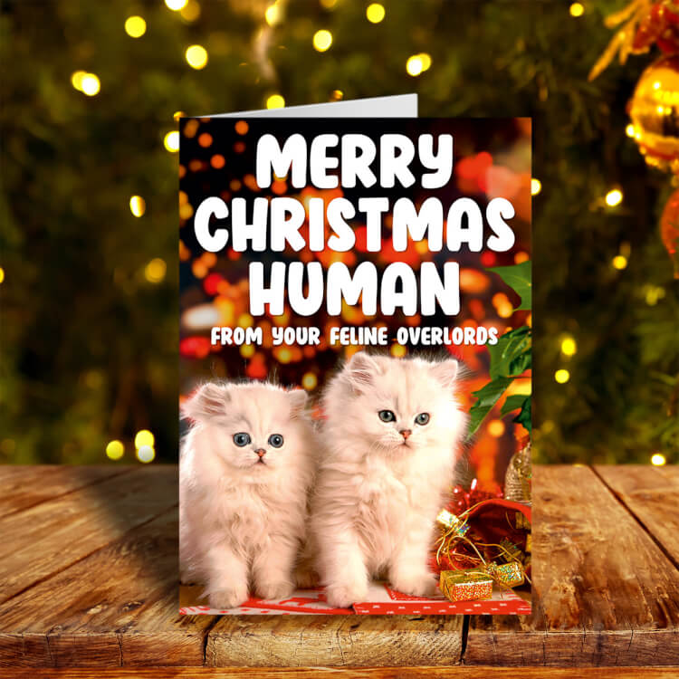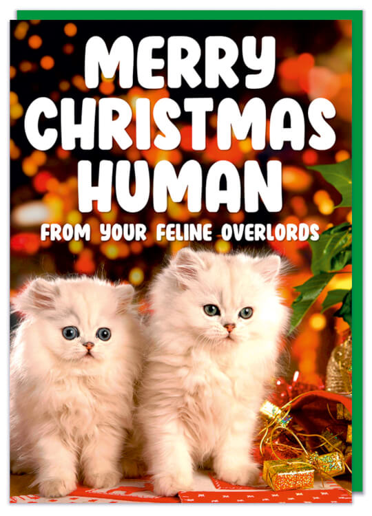 A Christmas card with a photograph of two cute white kittens surround by various Christmas decorations. Bold white capitalised text above them reads Merry Christmas human from your feline overlords.