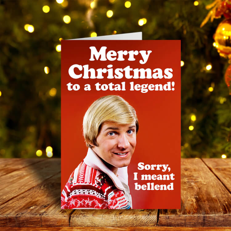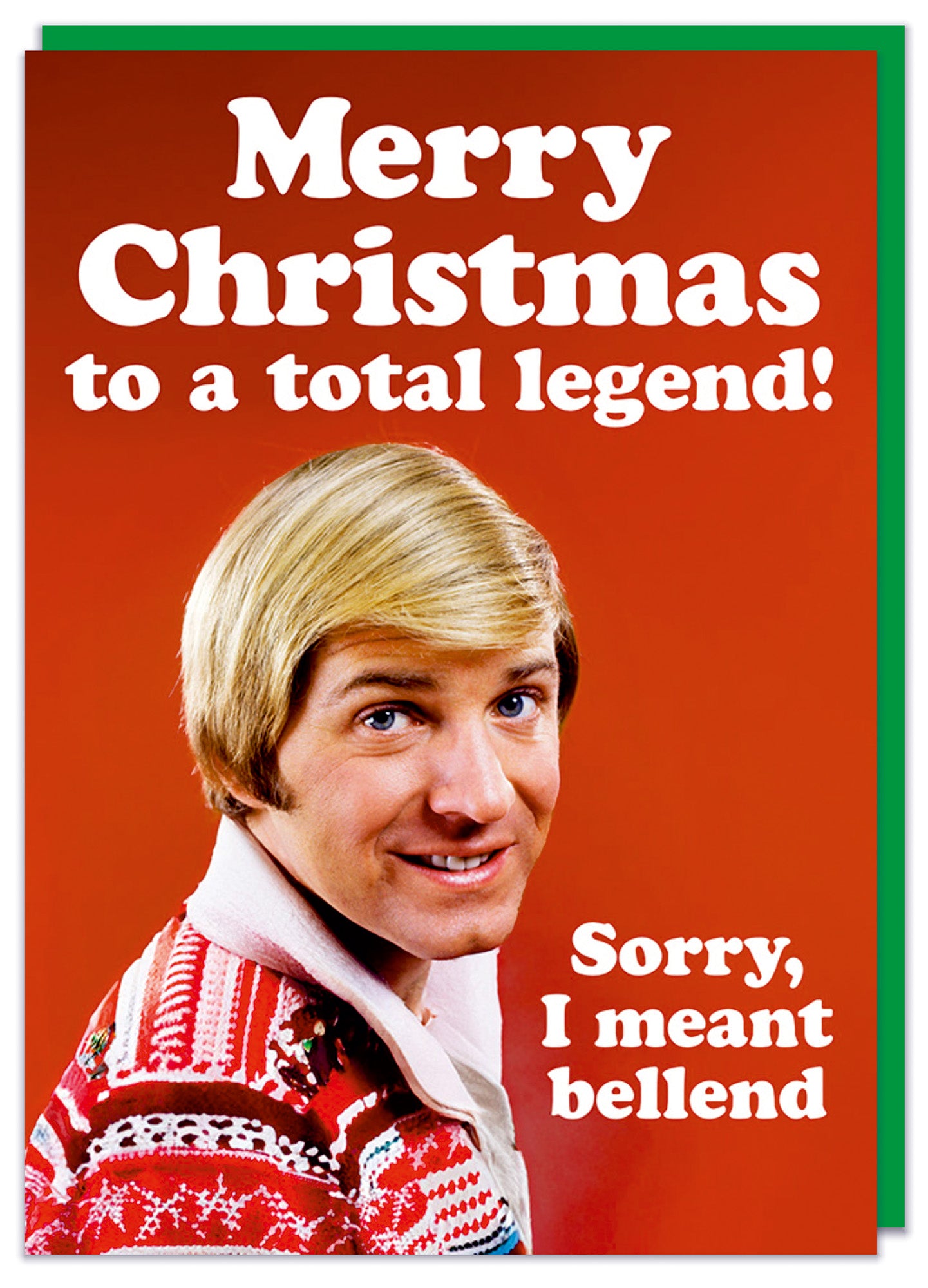 A funny Christmas card featuring a 1960s picture of a smiling man in a festive jumper surrounded by white text that reads Merry Christmas to a total legend, sorry I meant bellend.
