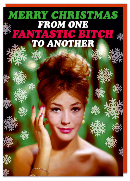 A Christmas card with a 1960s picture of a glamorous woman in front of a green background with snowflakes.Green, white and red text above reads Merry christmas from one fantastic bitch to another.