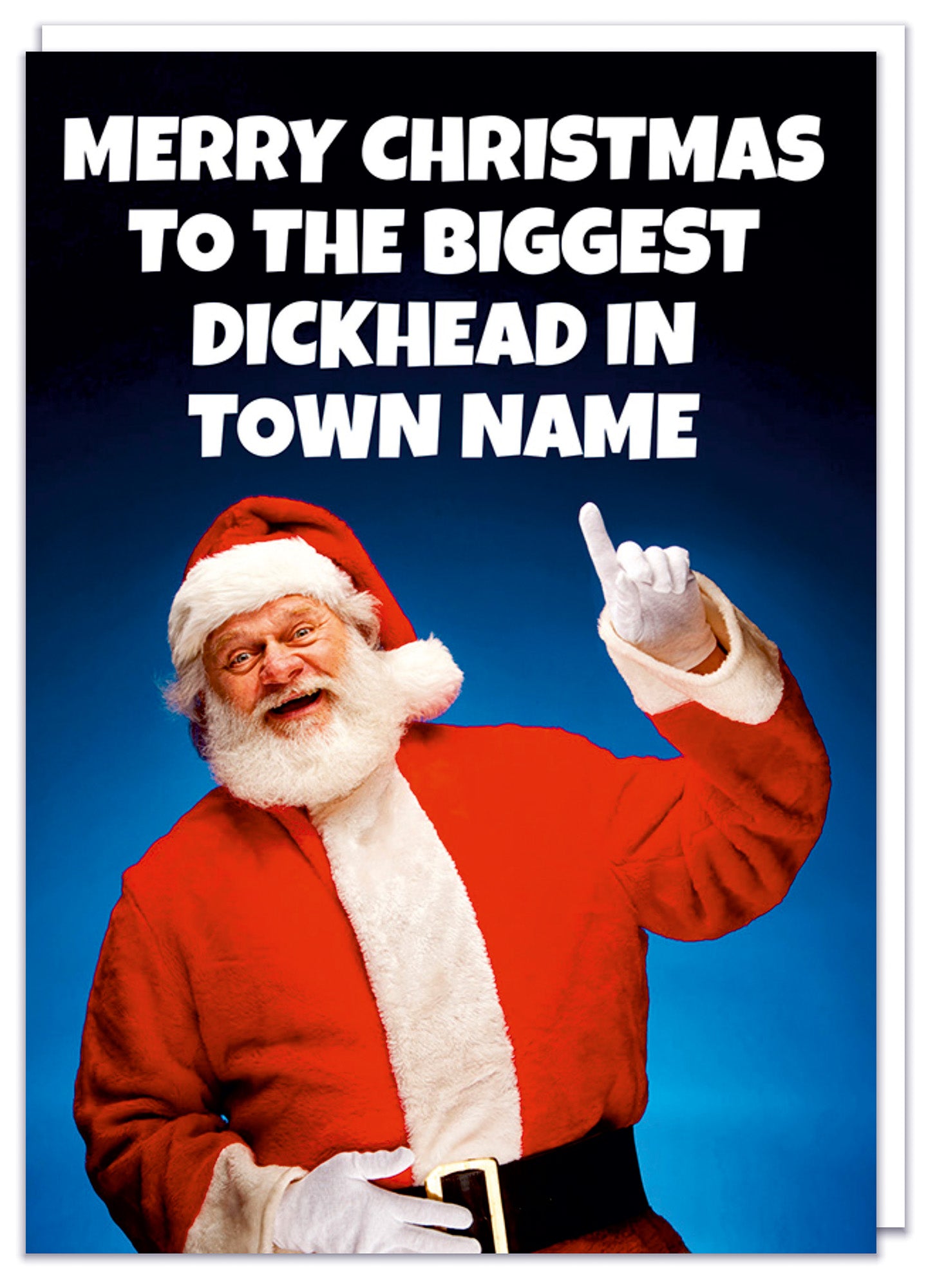A funny personalisable Christmas card featuring a picture of a smiling Santa Claus pointing upwards to jolly white text that reads Merry Christmas to the biggest dickhead in - town name.