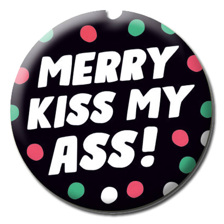 A black badge with red, green and white spots surrounding white text that reads Merry kiss my ass.