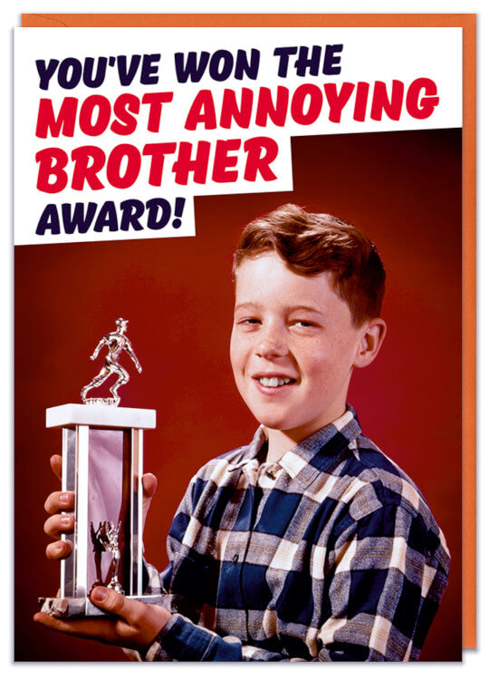 A greeting card with a 1960s picture of a young boy holding up an award. Text above reads You've won the most annoying brother award.