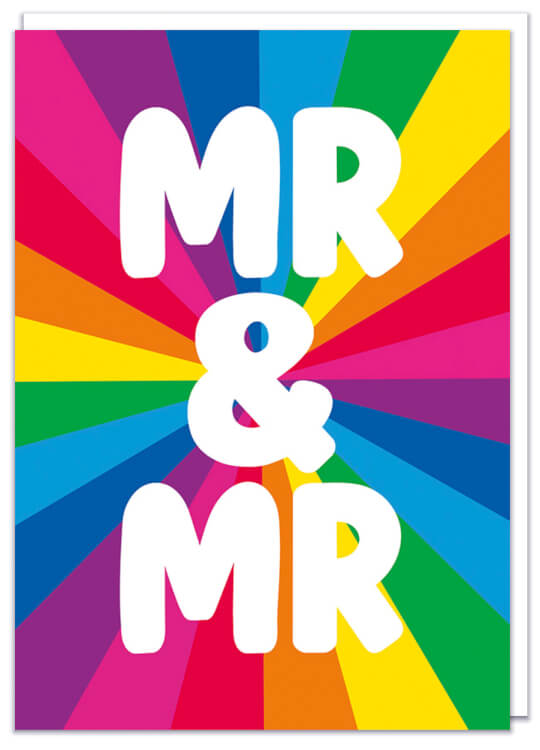 A greeting card, perfect for weddings featuring a rainbow stardust and in front bold white text that reads Mr & Mr