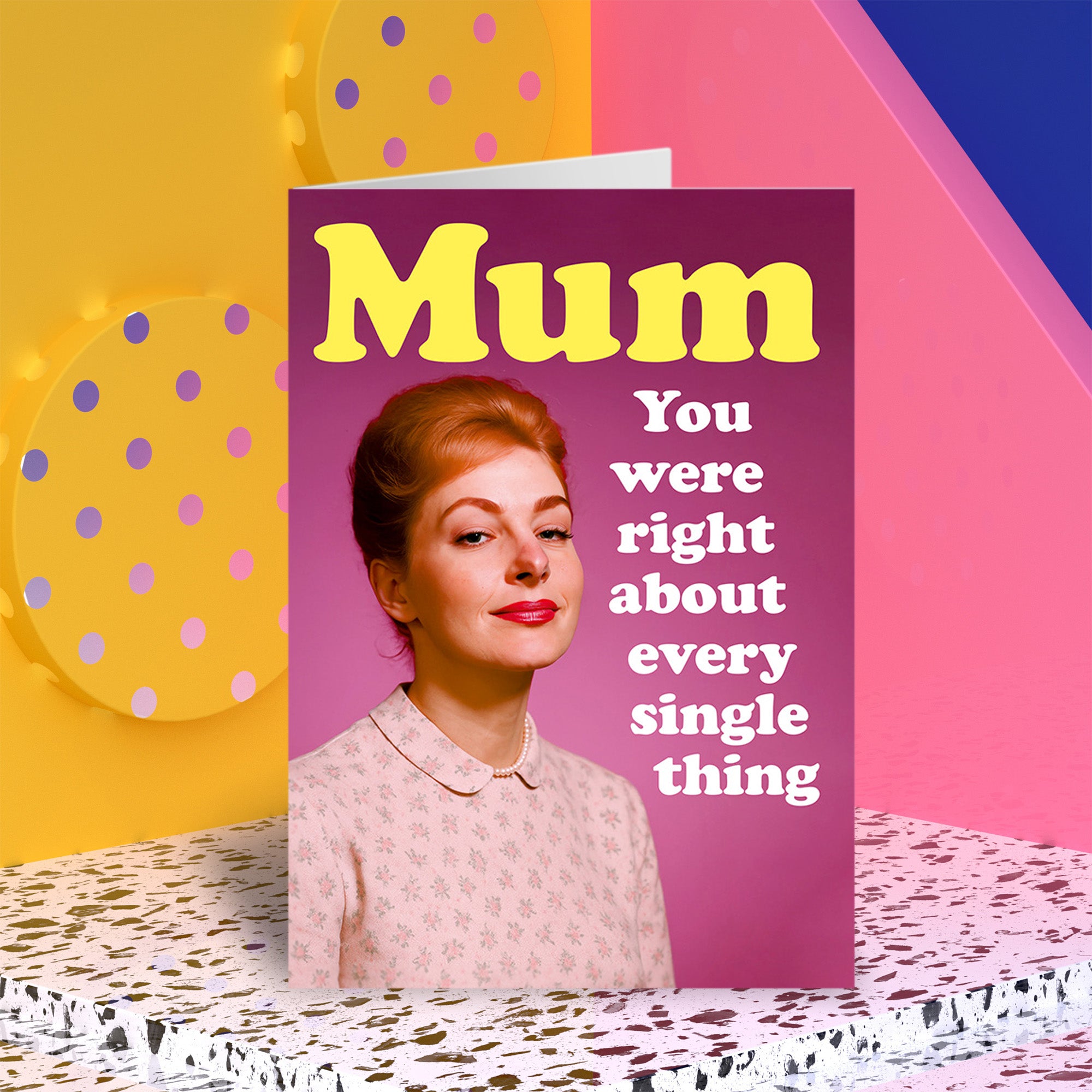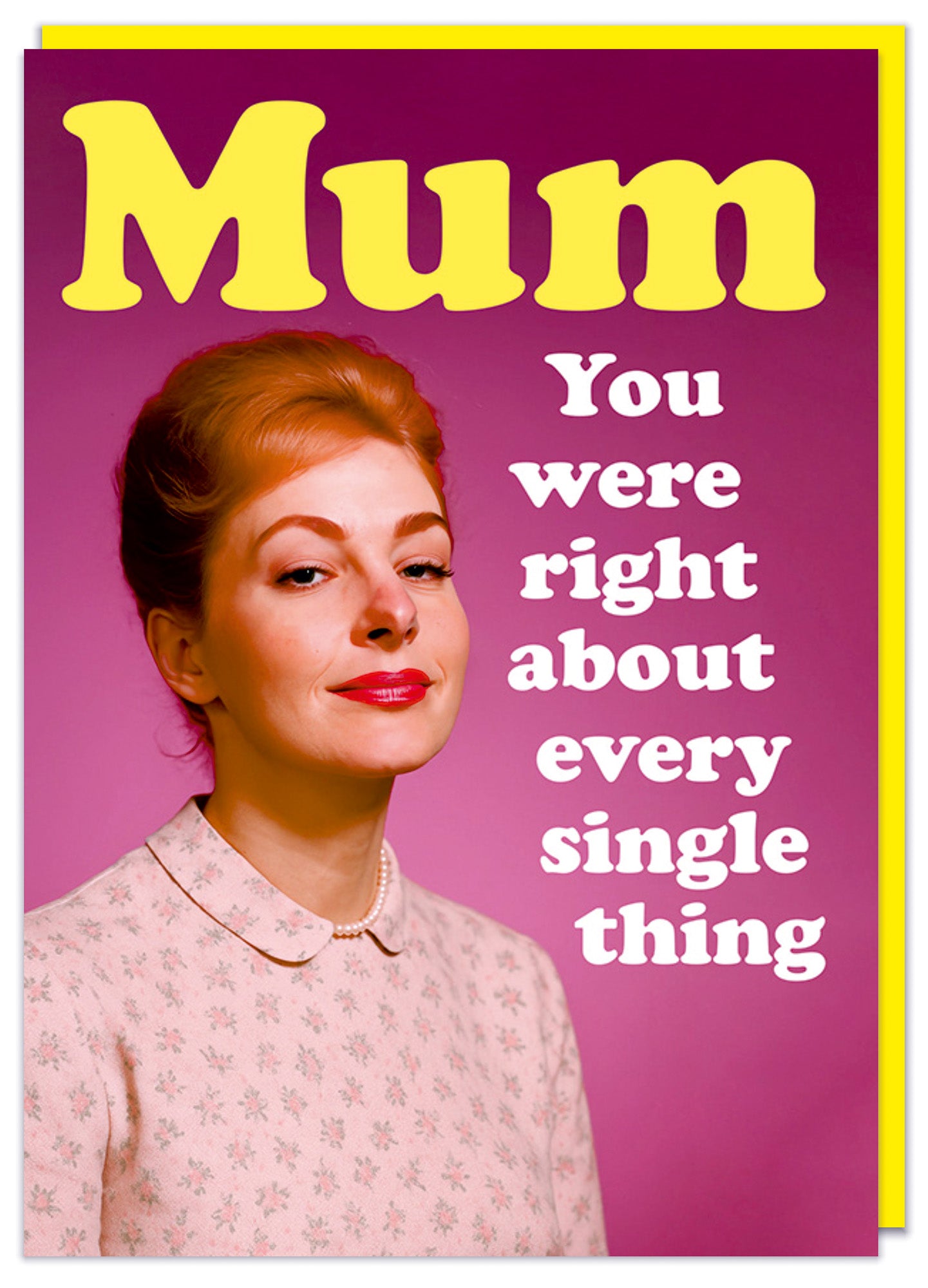 A funny Mother's Day card featuring a vintage-style portrait of a woman with auburn hair styled in an updo, wearing a pale patterned blouse and a pearl necklace. She is looking confidently toward the viewer with a knowing expression. The background is a pink-to-magenta gradient. Large rounded yellow text at the top reads “Mum” and white rounded text alongside her reads “You were right about every single thing.”