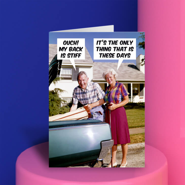 A birthday with a retro photo of an elderly couple loading golf clubs into their car boot. He says Ouch! My back is stiff to which she replies It's the only thing that is these days.