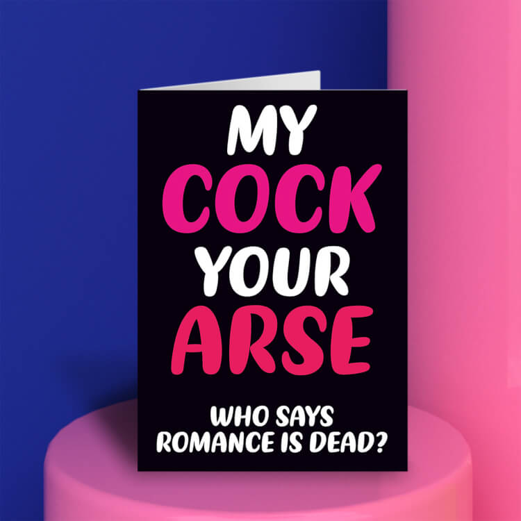 A black Valentines card with red and white text that reads My cock Your arse. Who says romance is dead?