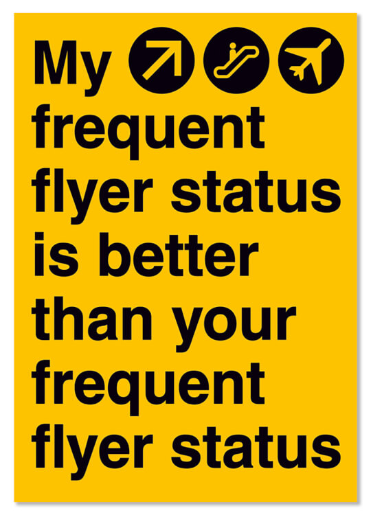 Here's just the job if you're into one-upmanship and want a postcard to reflect that! A nice bright yellow postcard with the words 'My frequent flyer status is better than your frequent flyer status' in black, below various airport signs