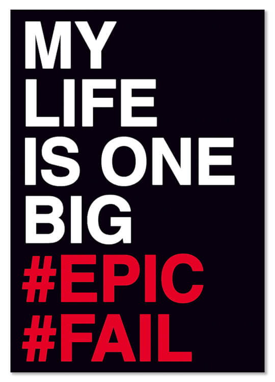 Feeling a little sorry for yourself? Spread the word and reach out for some sympathy using hashtags with this funny addition to our postcard collection. A black postcard with bold white and pink letters in capitals saying 'My Life Is One Big #Epic #Fail'