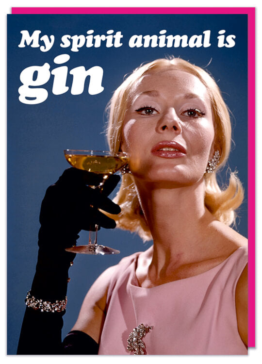 A greeting card with a picture of a classy but slightly drunk looking woman in a smart dress holding a glass to her face. White text above her reads My spirit animal is gin.