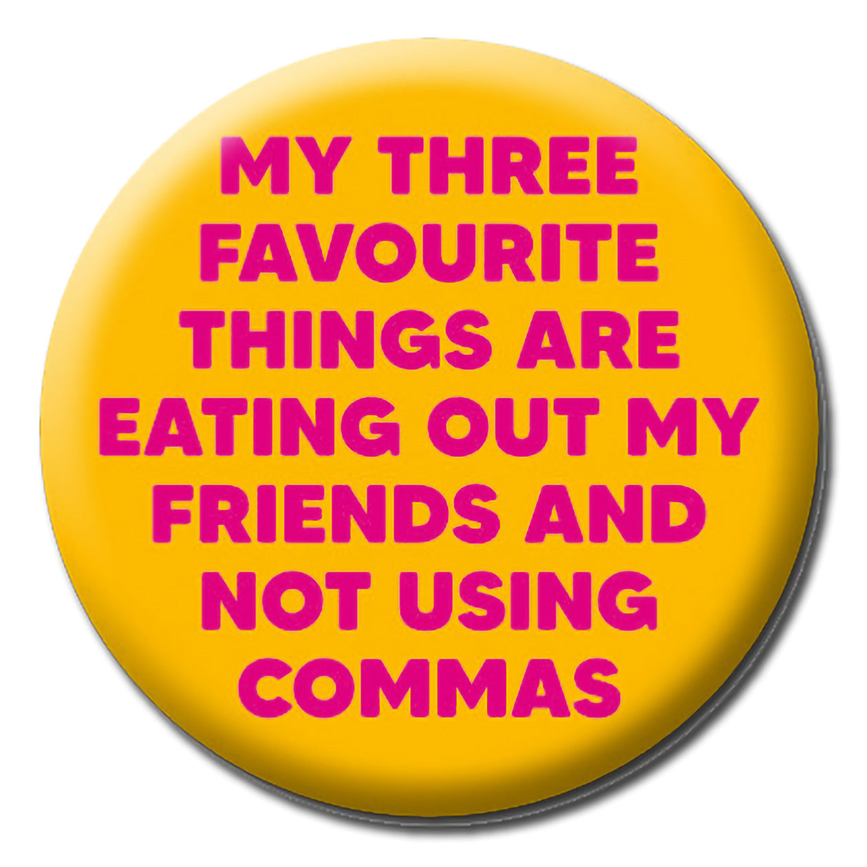 A round yellow badge featuring bold uppercase pink text. The text reads “My three favourite things are eating out my friends and not using commas.” There are no images or graphics, just the text centered on the badge.