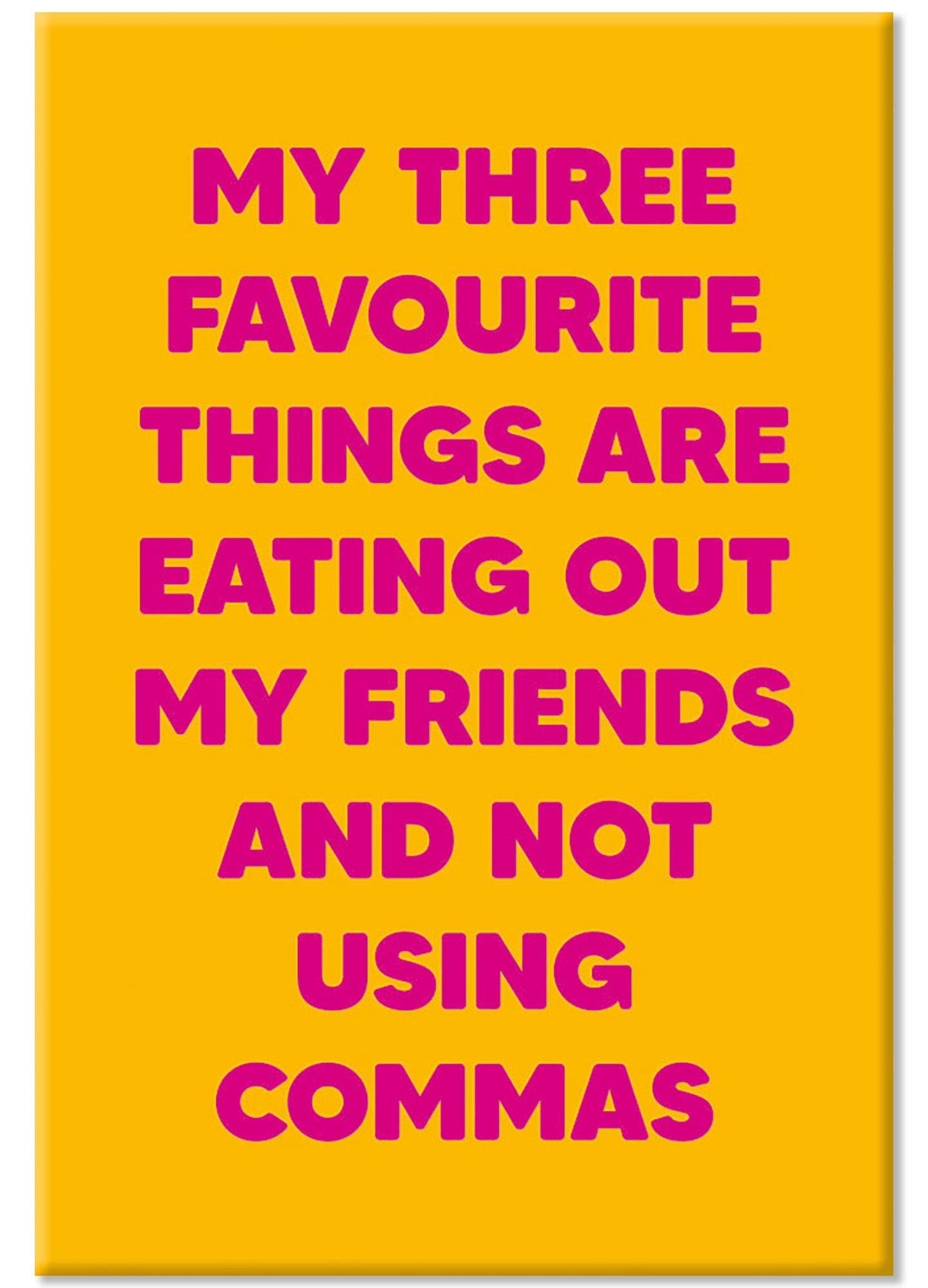 A yellow fridge magnet featuring the text “MY THREE FAVOURITE THINGS ARE EATING OUT MY FRIENDS AND NOT USING COMMAS” set in bold, blocky capital letters stacked neatly down the centre of the design. The background is a flat, vibrant yellow, while the text is a strong hot pink, creating a high-contrast, loud-as-hell look that matches the joke perfectly.