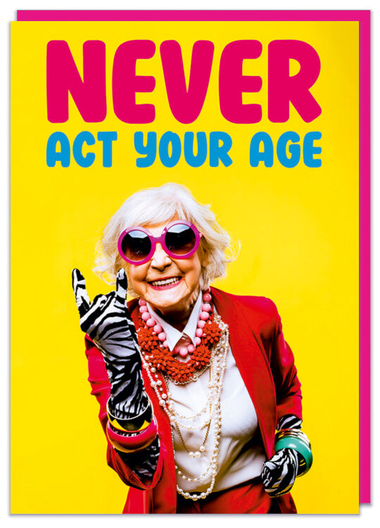 A bright yellow birthday card featuring a trendy elderly lady in a bright red jacket and big sunglasses. Bold pink and blue text above her reads Never grow up.