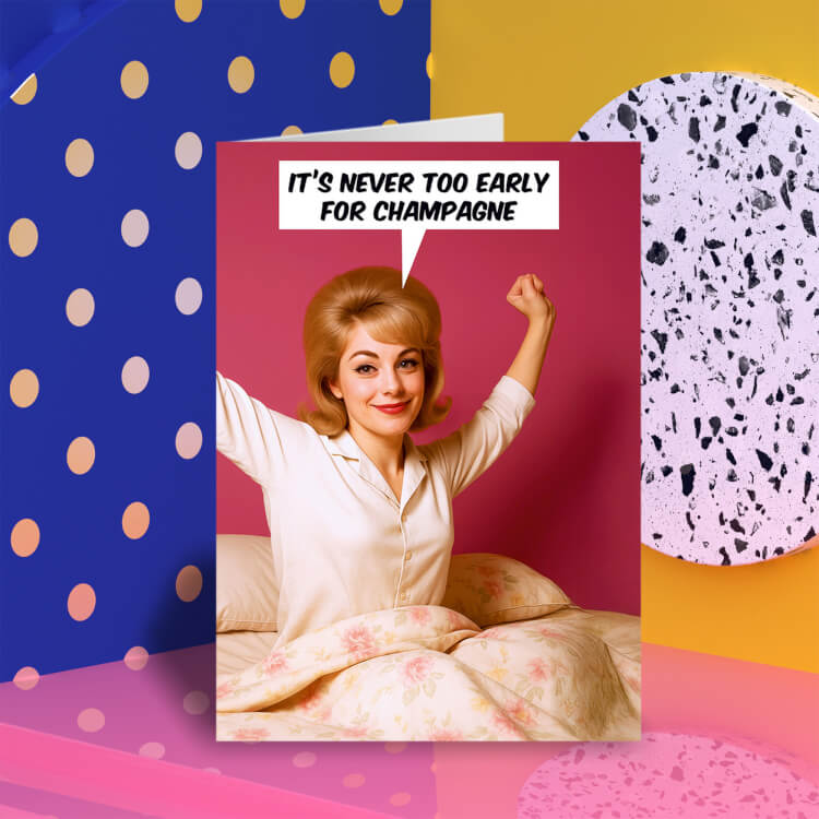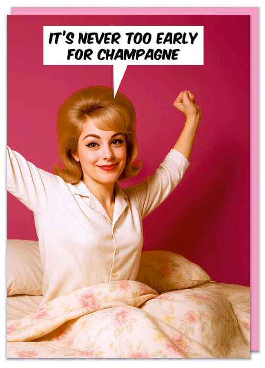A funny birthday card featuring a retro picture of a young glamourous woman in a nightdress waking up against a pink background. She's saying It's never too early for champagne.