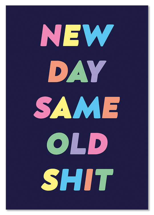 A dark navy blue postcard with multicoloured italic letters reading New Day Same Old Shit
