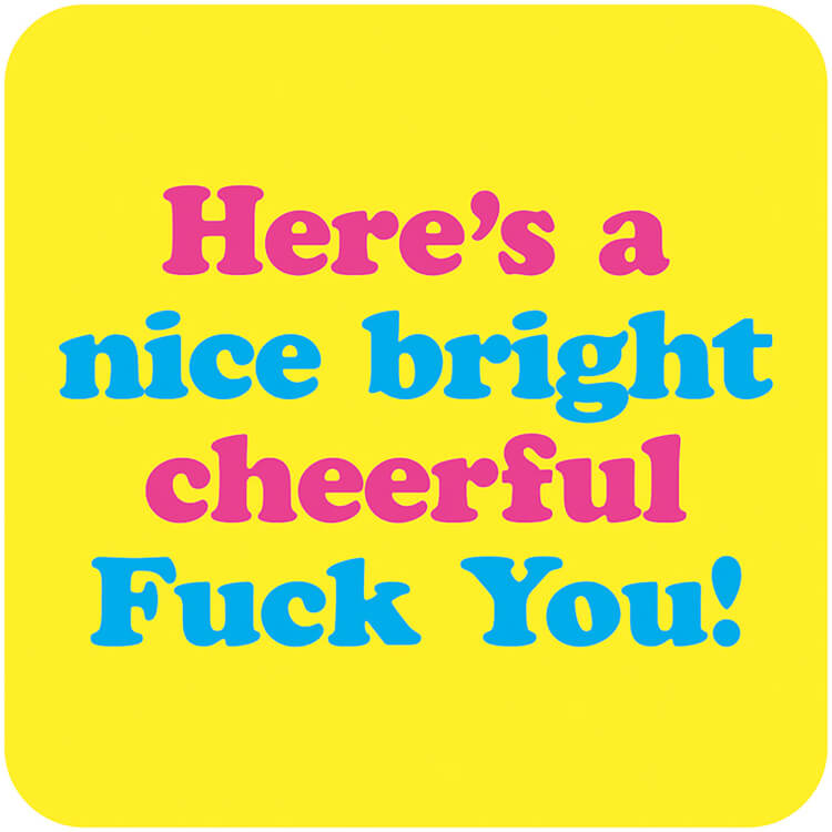 A bright yellow coaster with alternating blue and pink lower case text that reads Here's a nice bright cheerful fuck you.