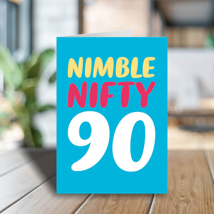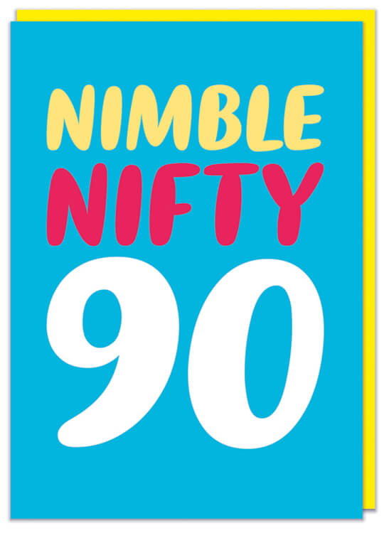 A bright purplee birthday card with yellow, pink and white rounded letters that reads Nimble nifty 90.