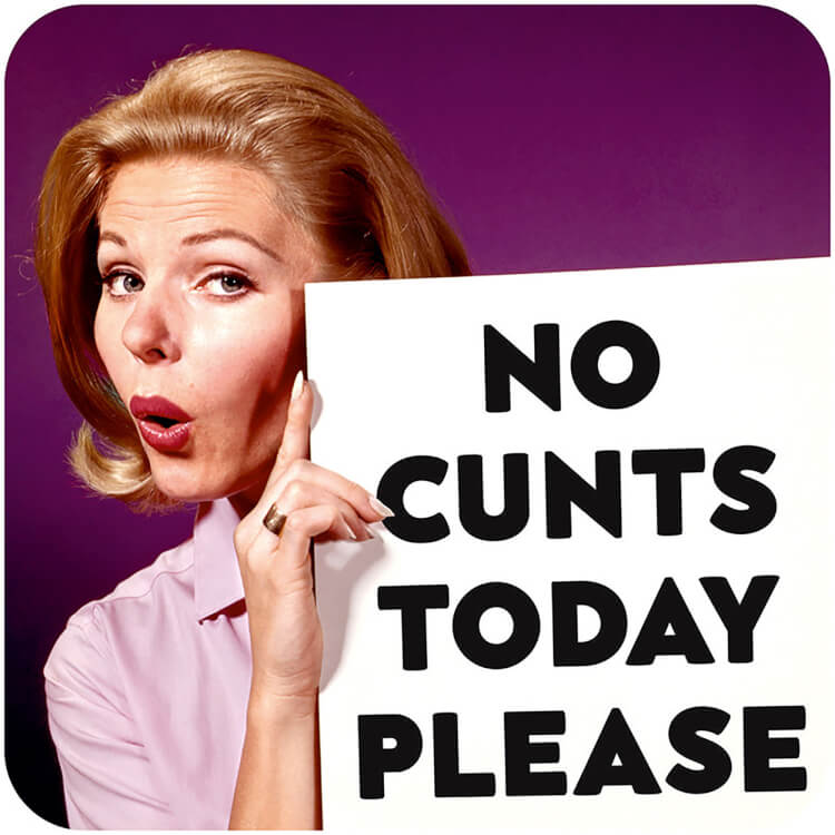 A coaster with a retro photo of a woman holding a sign reading no cunts today please.