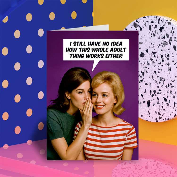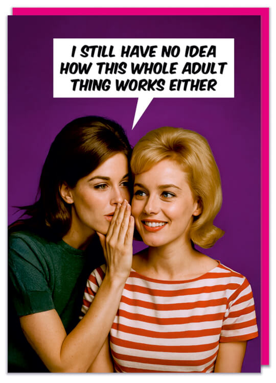 A funny birthday card with a 1960s picture of two young women closely whispering to each other in front of a purple background. One says I still have no idea how this whole adult thing works either.