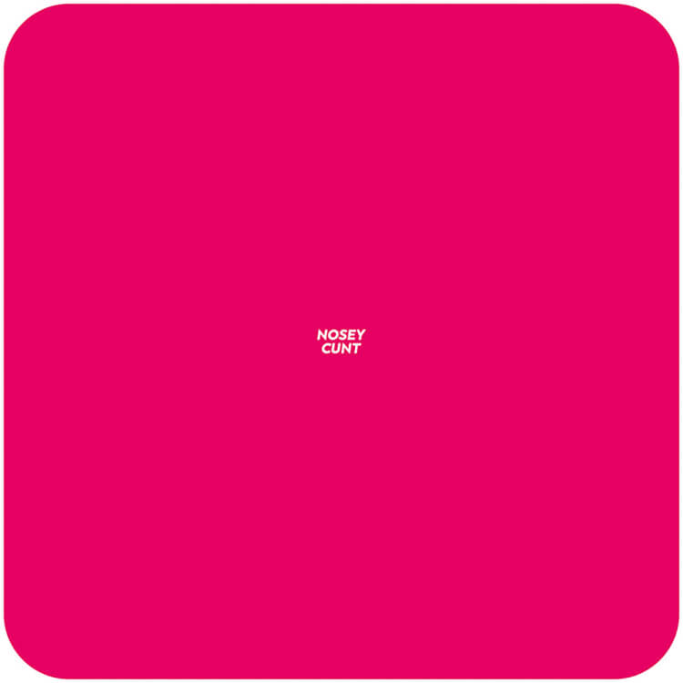 A deep pink coaster with very small capital letters in the middle reading nosey cunt.