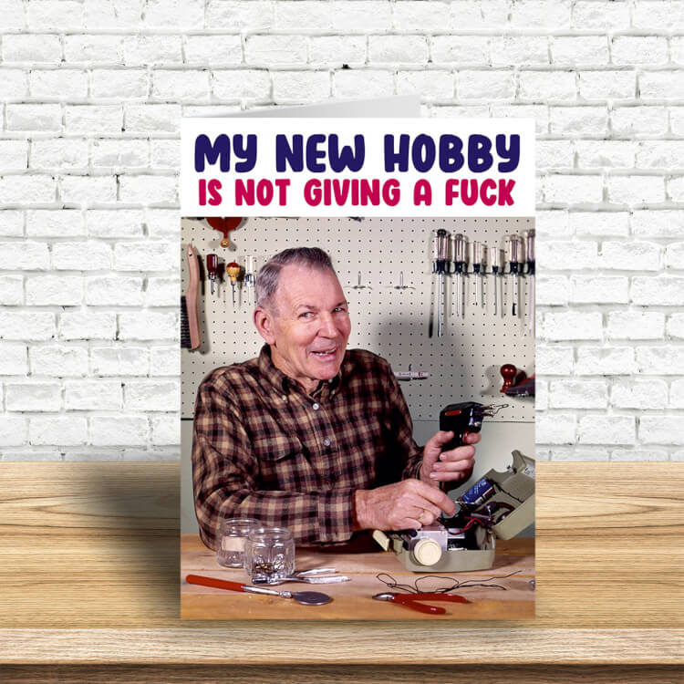 A birthday card with a retro picture of a smiling elderly gentleman in his toolshed. Dark blue and red text above him reads My new hobby is not giving a fuck.