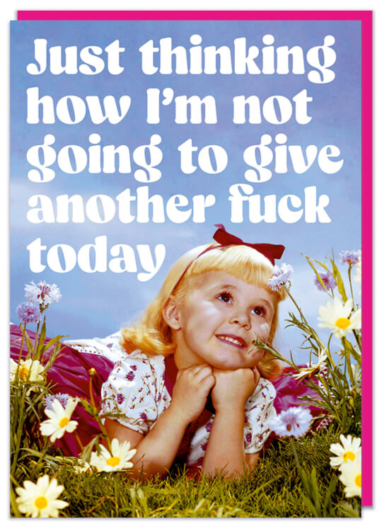 A greeting card with a retro picture of a sickly sweet girl lying down in a field of flowers looking up and smiling. White large text above her reads Just thinking how I'm not going to give another fuck today.
