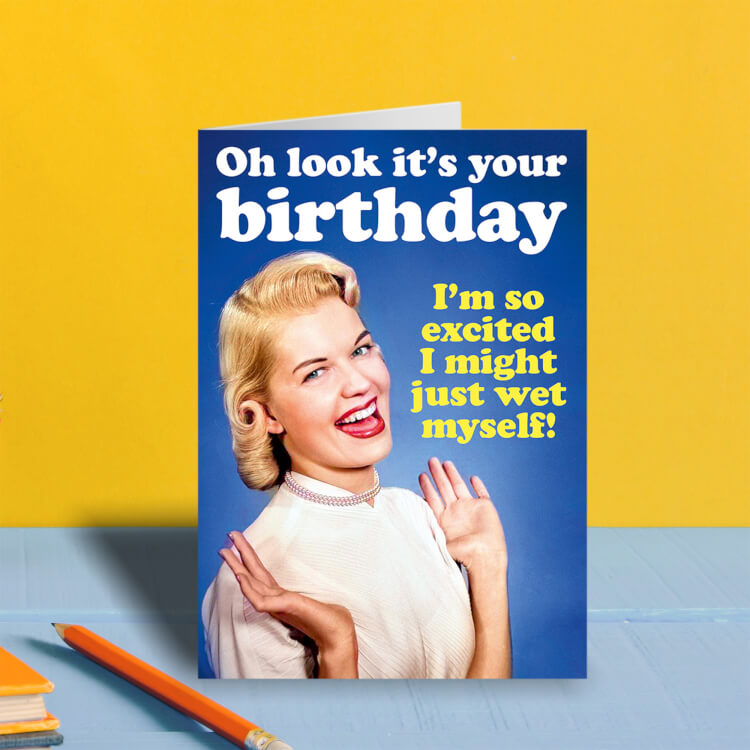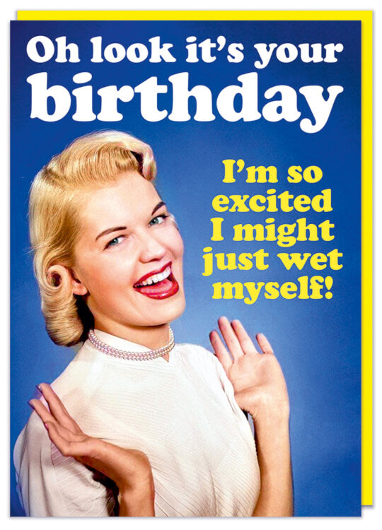 A birthday card with a 1960s picture of a sarcastic but excited young woman against a blue background. Text above and beside her reads Oh look it's your Birthday. I'm so excited I might just wet myself.