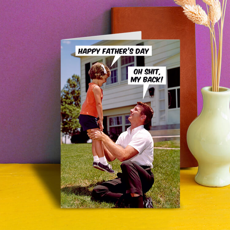 A funny birthday card featuring a retro picture of a father lifting up his daughter in their garden. She wishes him Happy father's day to which he replies Oh shit, my back!