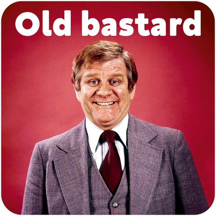 A coaster with a retro photo of a 1960's smiling man in a smart suit against a red background. White text above reads You old bastard.