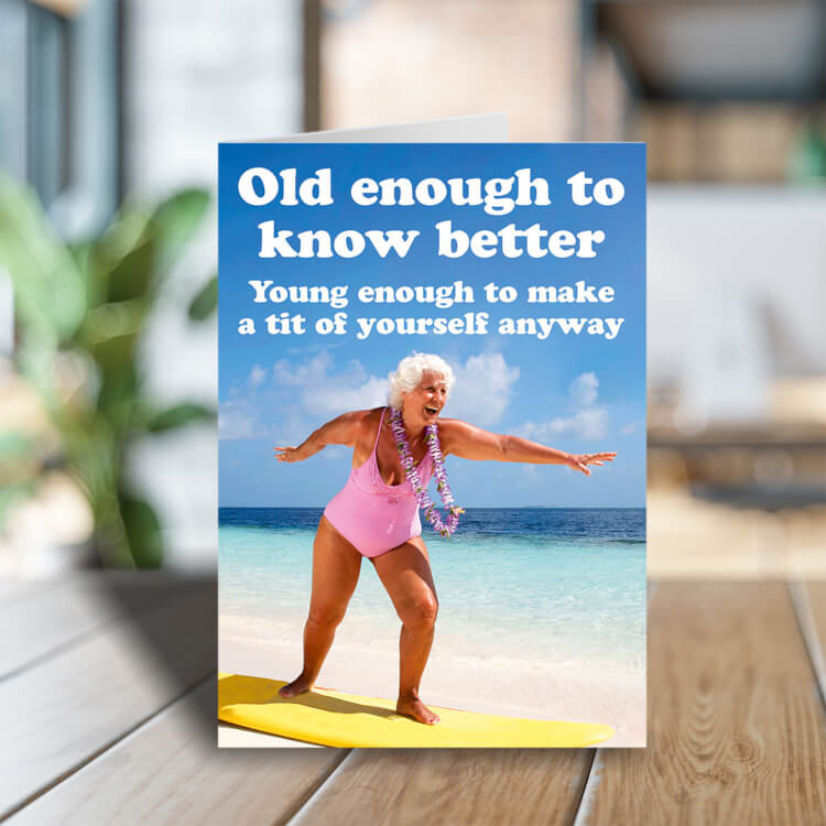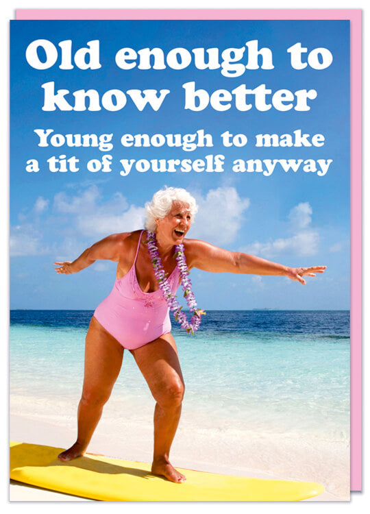 A birthday card with a photo of a smiling elderly woman posing on a surfboard on the shoreside of a sunny beach. White rounded text above reads Old enough to know better Young enough to make a tit of yourself anyway.