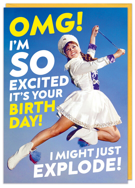 A birthday card with a retro picture of a cheerleader dressed all in white jumping excitedly into the air. Around her white and yellow bold capital text reads OMG! I'm so excited it's your Birthday! I might just explode!