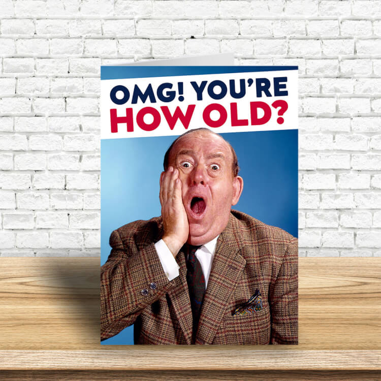 A birthday card with a 1960s of an shocked elderly man looking to camera. Above him blue and red capitalised text reads OMG! You're how old.