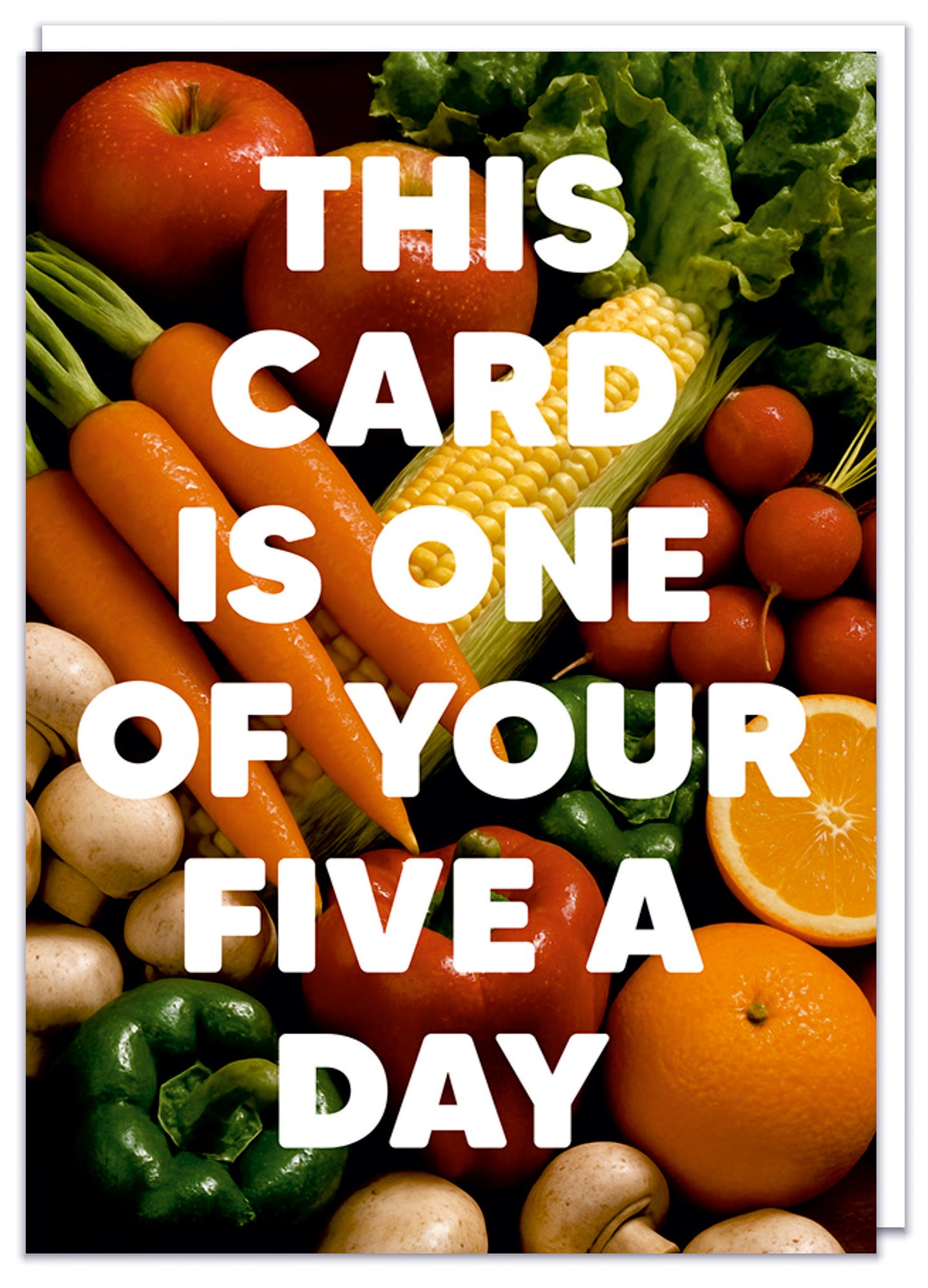 A funny birthday card with a retro picture of lots of healthy fruit and veg overlaid with bold white text that reads This card is one of your five a day.