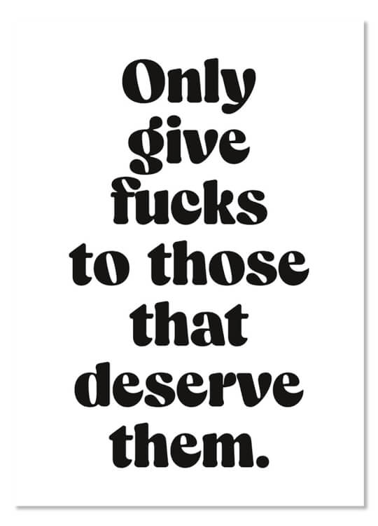 A simple white postcard with a rounded lowercase bold black font in the middle that reads Only give fucks to those that deserve them.