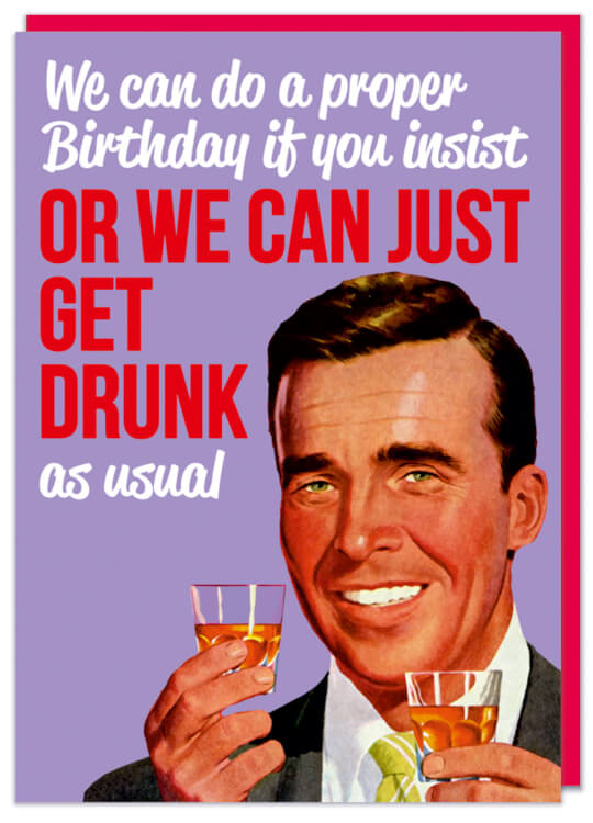 A lilac birthday card with a vintage style drawing of a cheery man in a suit holding up two shots of alcohol and the words ‘We can do a proper birthday if you insist or we can just get drunk as usual’ in white and red font.