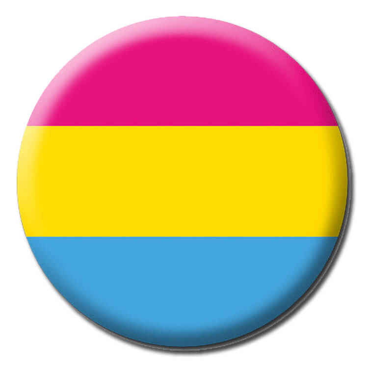 A badge with the pansexual pride colours of pink, yellow and blue.