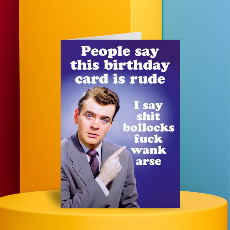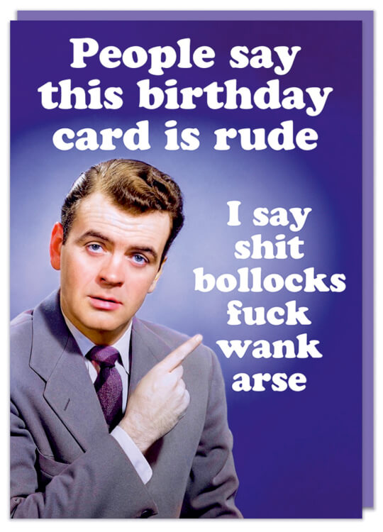 A funny retro birthday card featuring a serious looking man in a grey blue suit pointing to the side. White rounded text above him reads People say this birthday card is rude. He's pointing to text that reads I say shit bollocks fuck wank arse.