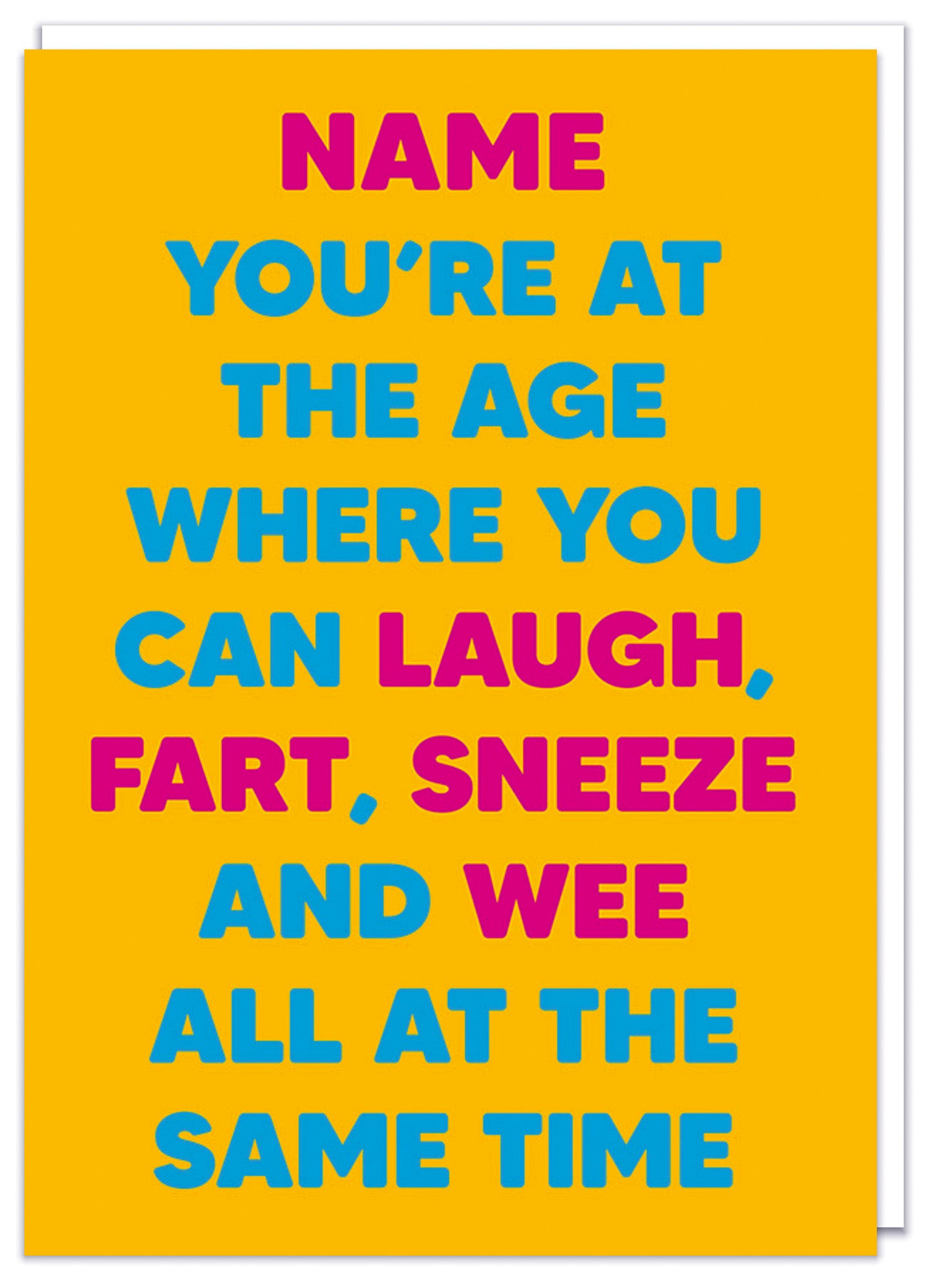 A funny personalisable bright deep yellow birthday card with bold pink and blue text that reads Name - You're at the age where you can laugh, fart, sneeze and wee all at the same time.
