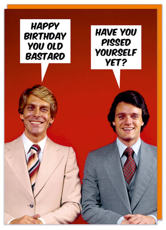 A 1960's photo of two smiling men in suits against a red background. One wishes Happy birthday you old bastard. The other asks Have you pissed yourself yet?