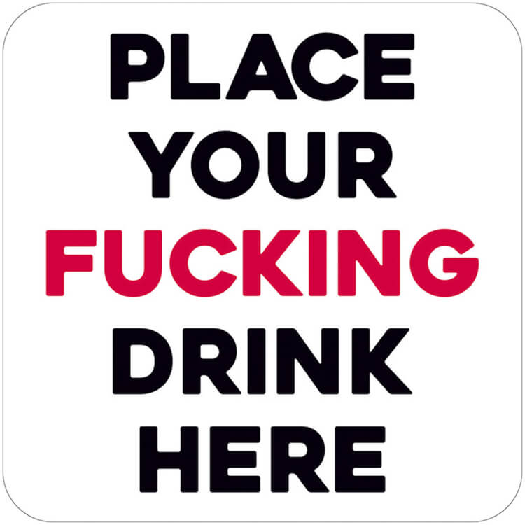 A plain white coaster with bold black and red capitalised text that reads Place your fucking drink here.
