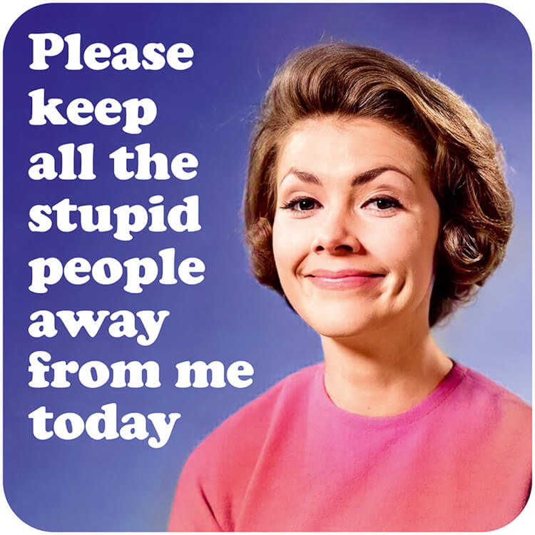 A coaster with a 1960s picture of a smiling sarcastic looking woman looking to camera against a blue background. White rounded text beside her reads Please keep all the stupid people away from me today.