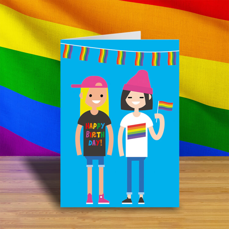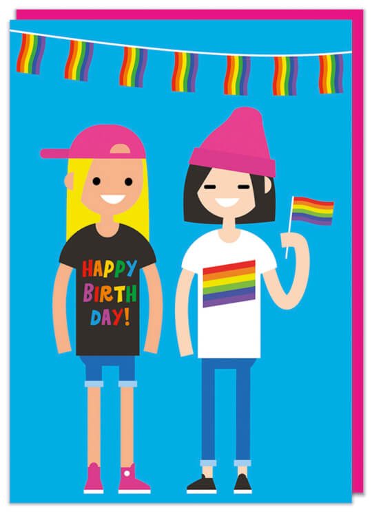 A bright blue gay birthday card featuring a cute illustration of two girls with rainbow apparel and waving a classic pride flag. Multicoloured text on one t shirt reads Happy Birthday.