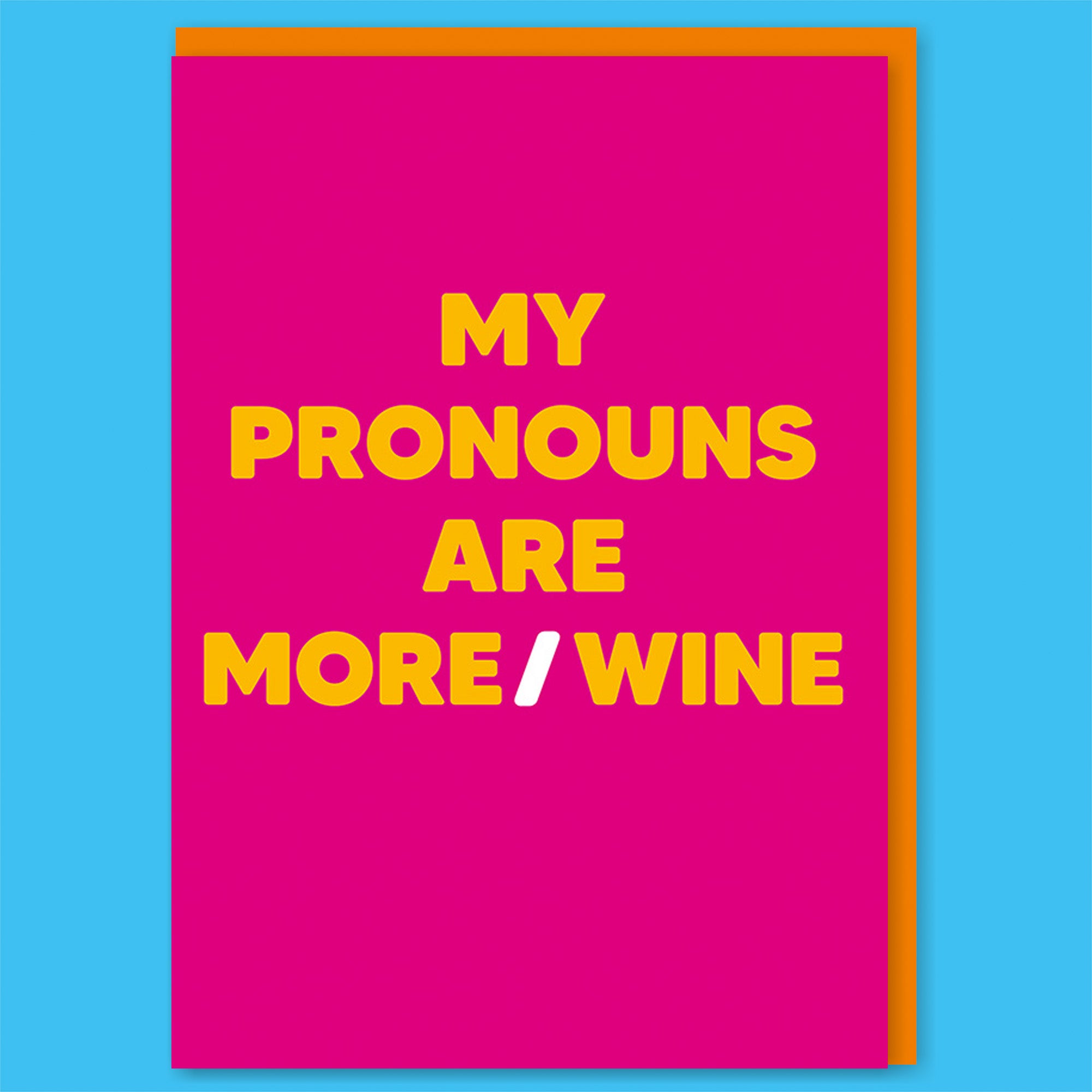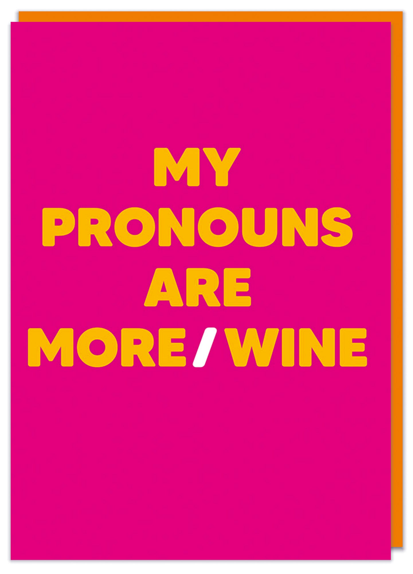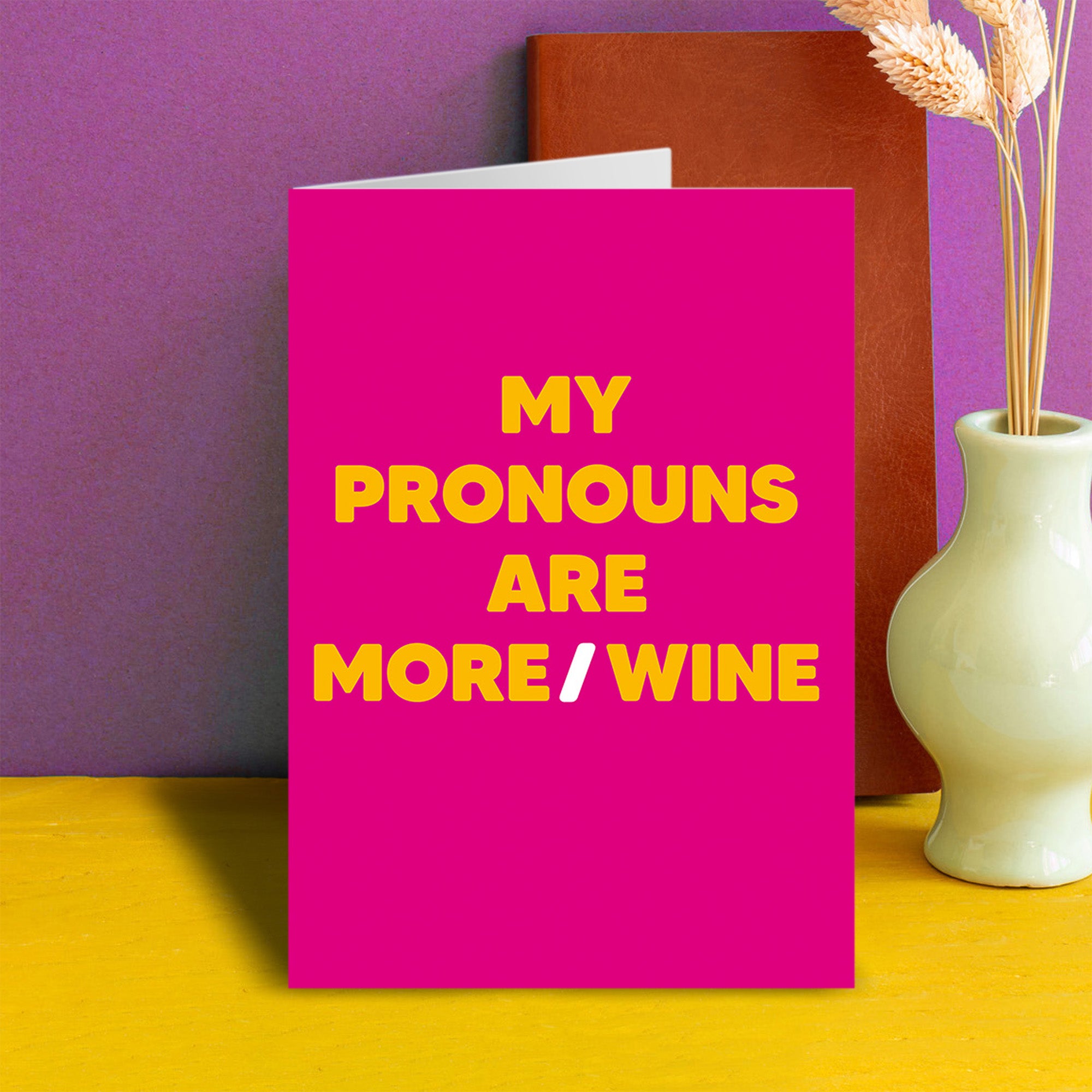 A greeting card featuring bold typographic text arranged in four lines. The text reads “My pronouns are more / wine.” The background is a bright pink colour, with most of the text in yellow and the slash and word “wine” highlighted in white.