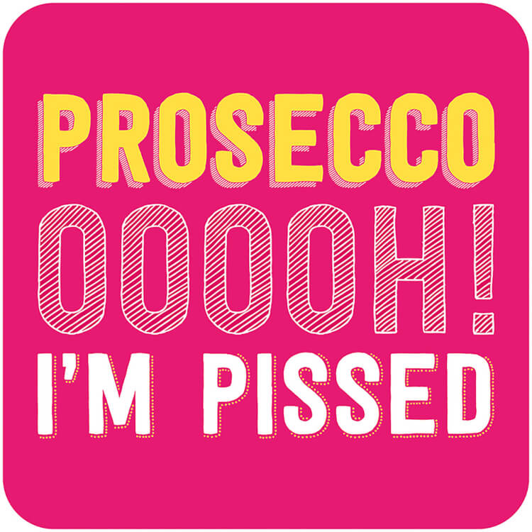 A vibrant pink coaster with the words ‘Prosecco ooooh! I’m pissed’ in capitalised, yellow 3D font and capitalised, white doodling style font.